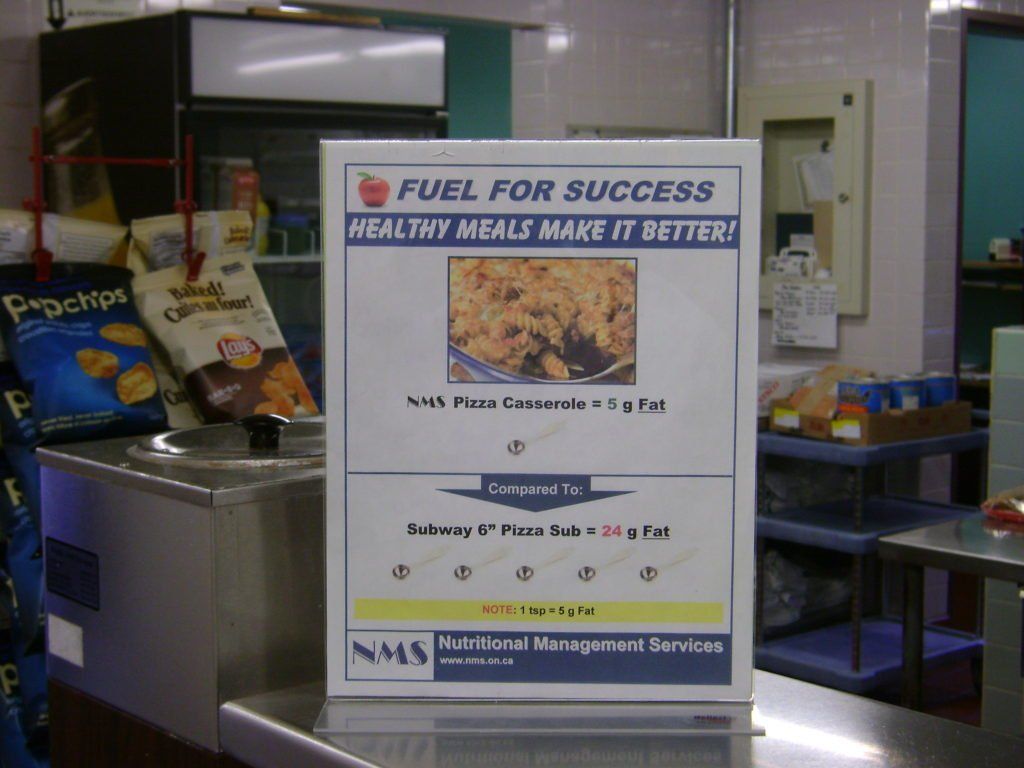 NMS’ goal with Fuel for Success is to educate students about healthy eating choices and to promote eating in the cafeteria instead of fast food establishments. Our Fuel for Success Marketing Program posters provide a daily reminder of how to eat healthy all day long.  Our Fuel for Success Program also includes Nutrition Quizes which promote healthy choices and the knowledge behind why we need to choose healthy options more often. NMS is also able to make a presentation in the classroom setting on nutrition and healthy eating.